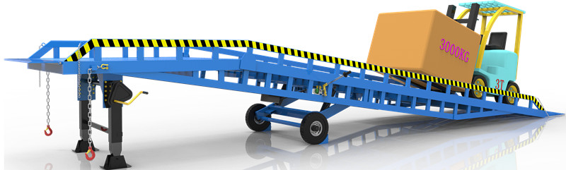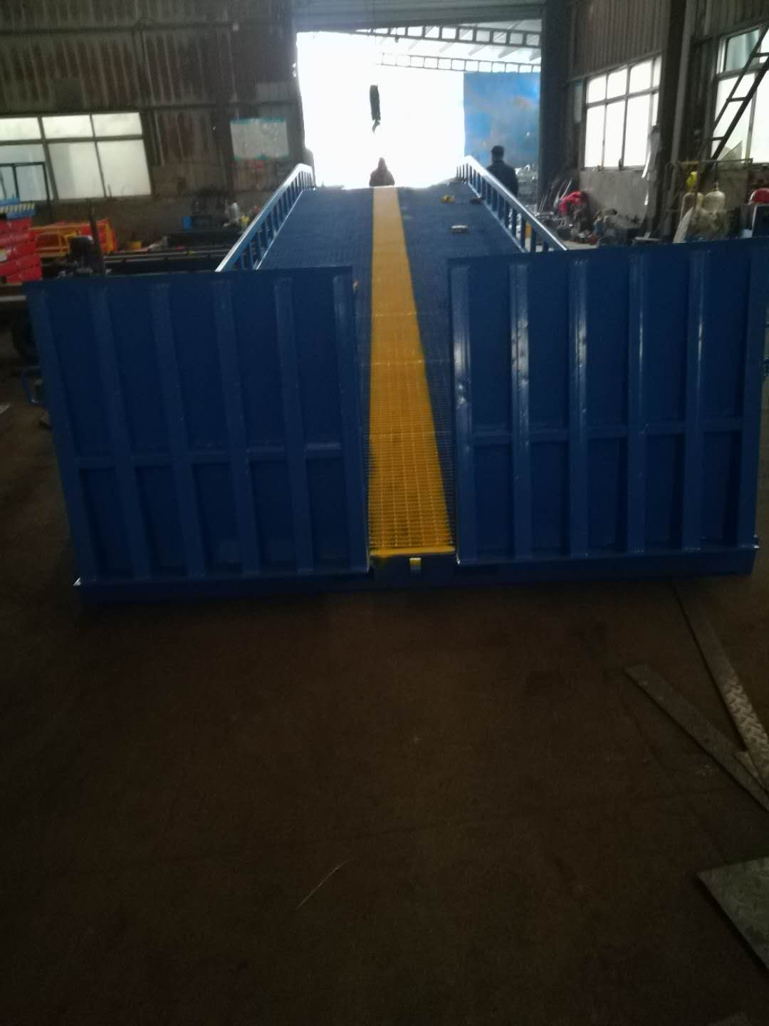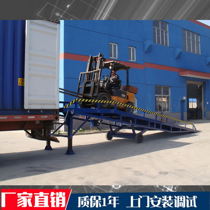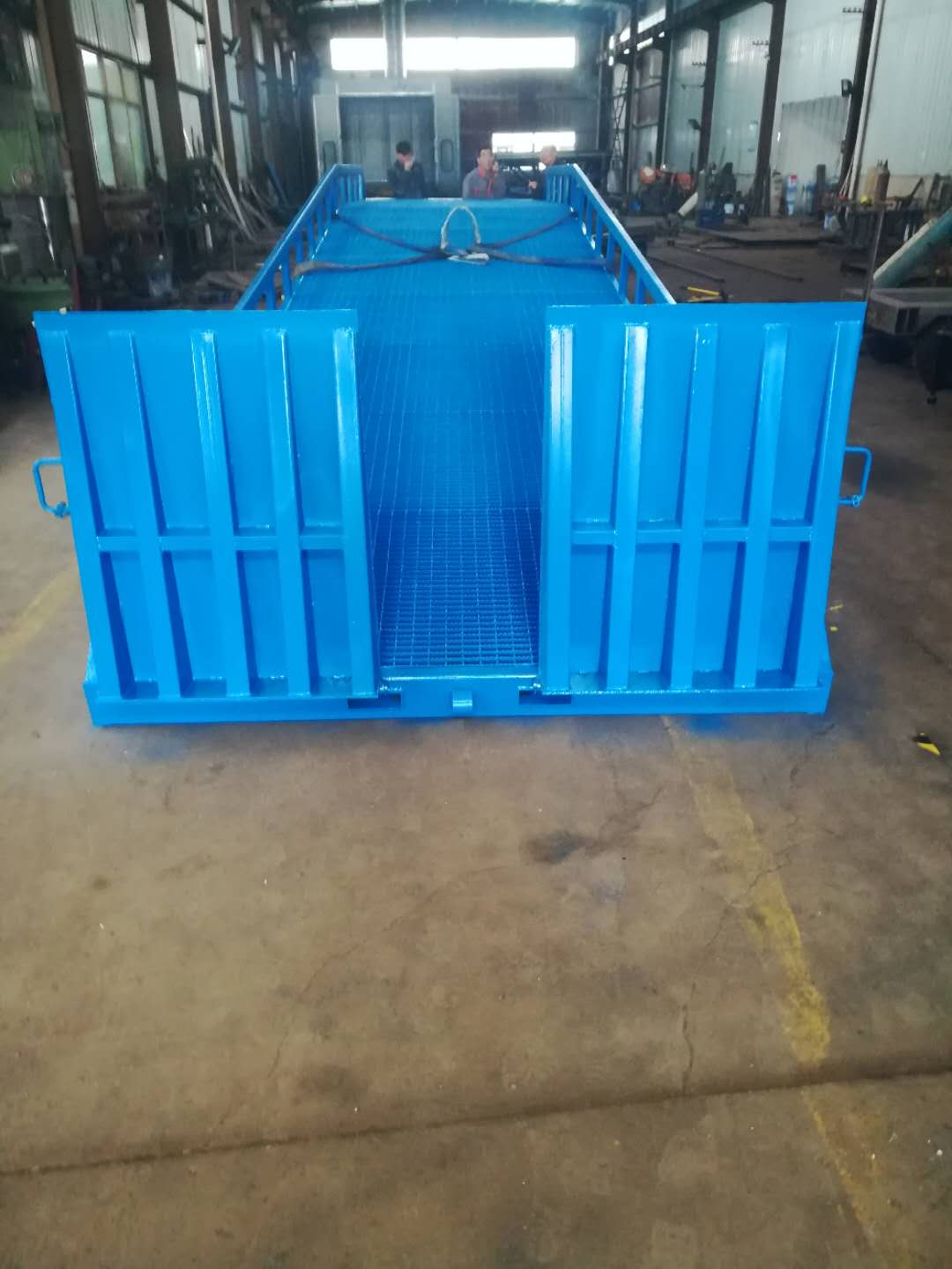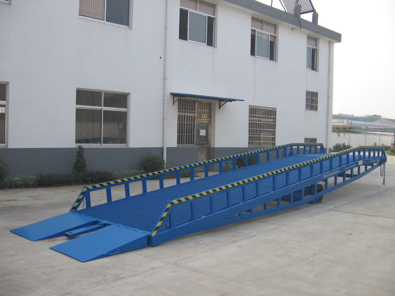 移動式液壓登車橋是與叉車配合使用的貨物裝 卸專用輔助設備。有了它,叉車能直接從地面駛入汽車車廂內部進行 批量裝卸作業(yè)。